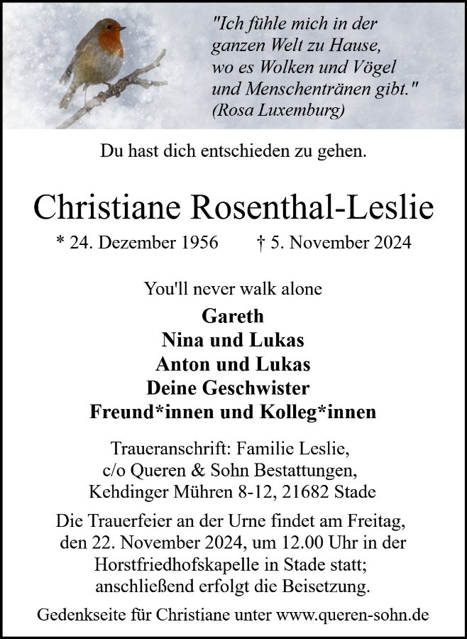 We have many memories of Christiane from when our children were in elementary school together. From our chats in the music school waiting room, to the afternoon Hoya lessons , from the „Star singers“ to the evenings at the English Carol Service, Christiane was always so friendly and caring. She took the time to listen and was a great support when it came to raising our bilingual children. We will miss her.