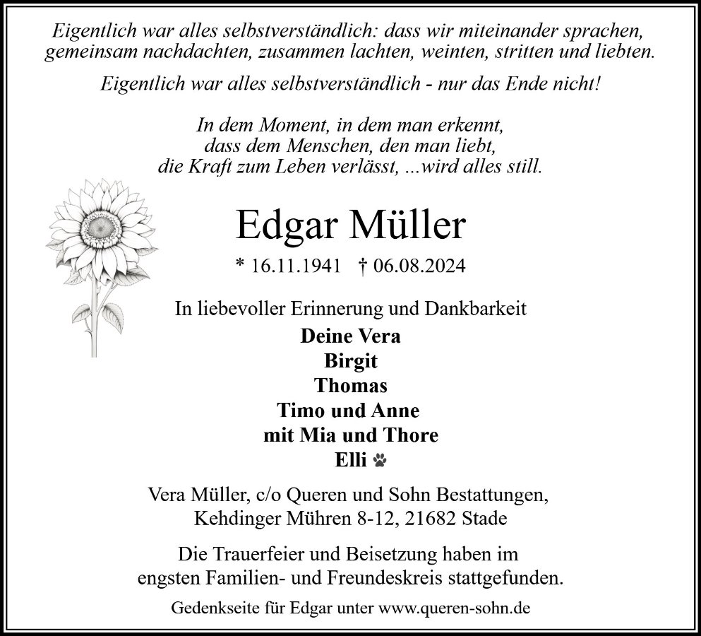 Ich kondoliere der lieben Familie Müller und bedauere ihren Verlust.