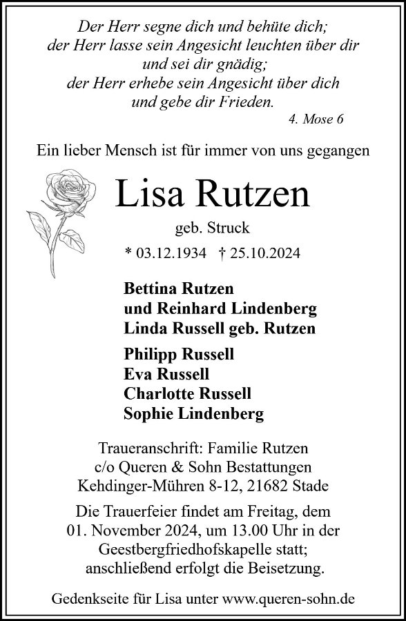 Liebe Lisa.Durch die Zustellung deiner Zeitung haben wir uns kennengelernt.Leider können wir uns nicht mehr treffen,obwohl wir es uns fest vorgenommen hatten.Ich danke Dir für all deine Fürsorge und lieben Worte in meiner schweren Zeit mit Simone.Jetzt kannst wenigstens Du wieder mit ihr Kaffee trinken und plaudern.Ich werde Dich nie vergessen und unsere Telefonate sehr vermissen.Du warst ein wundervoller Mensch mit einem Herz aus Gold.Fühl Dich ein letztes Mal ganz doll gedrückt.Deine Jana.